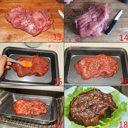 15、将肉放入烤盘内,肉皮朝上,表面刷盐水(这是关键哦,跟大厨学的,据说这样烤出来的肉皮不干韧)。