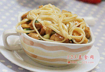 2、把煮好的面条放入碗中。加入炒好的豆腐鸡丁。拌匀就可以吃了。香喷喷的,裹着汁的面条特好吃。妈妈赞不绝口,呵呵,东北阿姨擀的面条就是够筋道。[sushi.laoyanhuo.com]