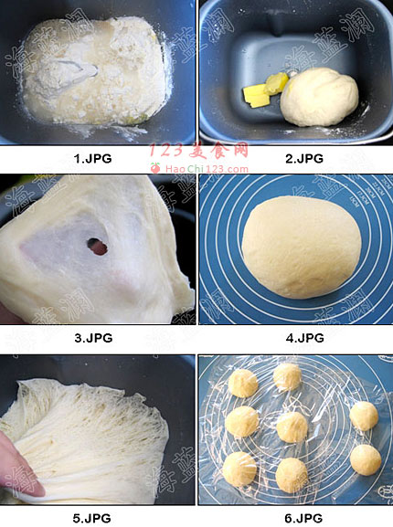 2、用面包机揉面,加黄油前30-40分钟左右,加黄油后30-40分钟左右。