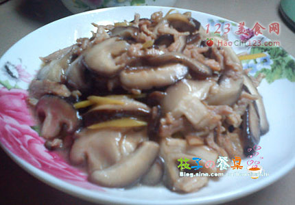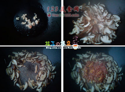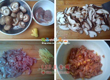3、锅烧热倒入食用油,(我这次因为有一点肥肉,我放在锅里炸了一下)待油烧热后倒入切好的冬菇,大火翻炒,看到冬菇慢慢软下后,把冬菇扒向四周,留出锅底倒入腌好的肉丝进行翻炒。待肉变色后,调入适量的食盐起锅即可。