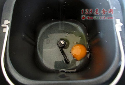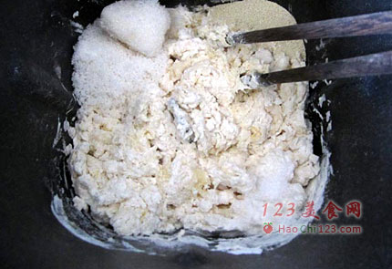 3、加入盐、糖和酵母,糖和酵母对角放,省得失去酵母的活性。