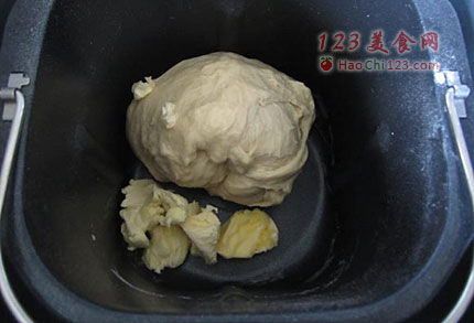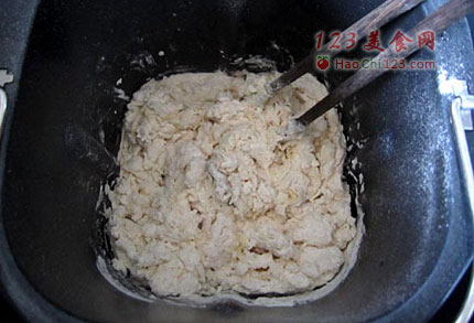 4、启动面包机自主和面功能,先和面18分钟,为了拉丝效果更好所以提前揉了一次。