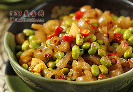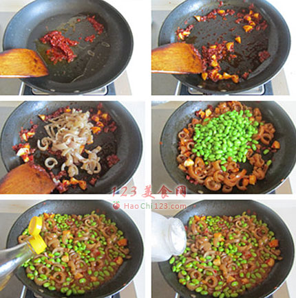 2、烧热锅,爆香剁碎的豆瓣酱翻炒,翻炒出红油后加入准备好的肉皮丝,再加入毛豆米一起翻炒,最后加入料酒和盐等调味料翻炒均匀即可。[sushi.laoyanhuo.com]
