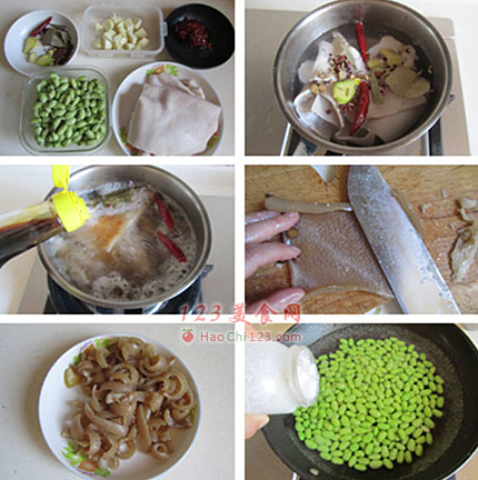 1、猪肉皮先拔干净毛,再放入锅中,加入大料卤煮熟;煮熟后的肉皮拿出来进一步去除后面的油脂,再切成丝备用;毛豆米焯熟到八、九层熟。