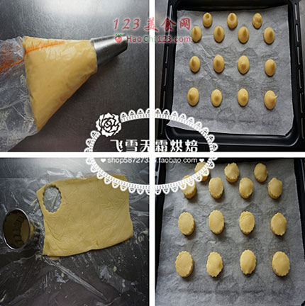 14、烤盘上放硅油纸,在烤盘中挤出一个个小圆球。