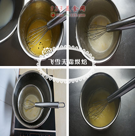 5、牛奶在电磁炉上加热至开,蛋黄糊中加少许香草籽,将牛奶慢慢的倒入蛋黄糊中。