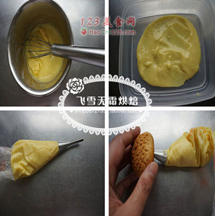 13、将圆口花嘴装入挤花袋中,再把面糊放入挤花袋。