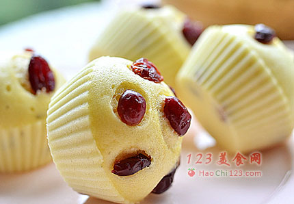 7、将面糊均匀地分装入6只麦芬模中,装8分满,表面撒几颗蔓越莓。