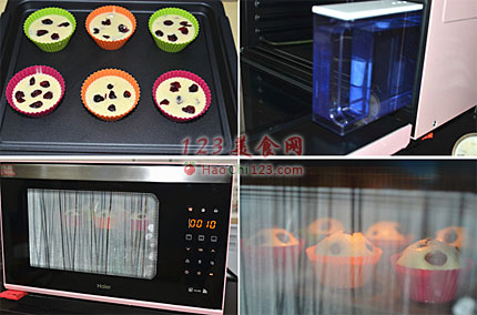 9、当预热完毕,蒸汽升腾时将模具放入烤箱中层,开始蒸蛋糕。