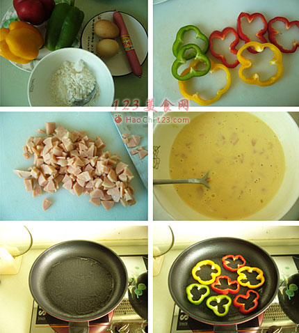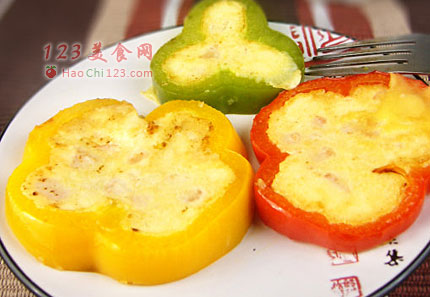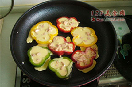 6、把面糊填入彩椒圈,转偏小火煎定型,翻面煎熟即可。