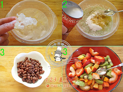 4、各式水果洗净切块,加适量蜂蜜、一点点盐拌匀,最后和西米、红豆、银耳一起装在碗里,吃前拌匀即可。