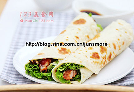 4、除了秘制酱汁烤鸡腿,其他你喜欢的烤肉、蔬菜都可以放在面饼里卷起来。如果放上炸鸡柳、甜面酱、黄瓜条、葱段卷起来,就是老北京鸡肉卷了哈。[sushi.laoyanhuo.com]