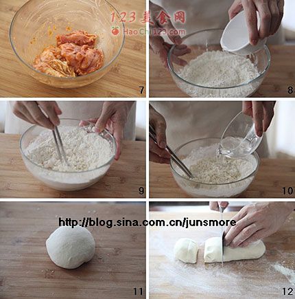 3、这款鸡肉腿卷的饼皮,用适量开水和面,使饼皮的含水量更高,同时降低面团的延展性,使面团更好擀开。一定要把面和得软软的,烙出的面饼口感才好哦。