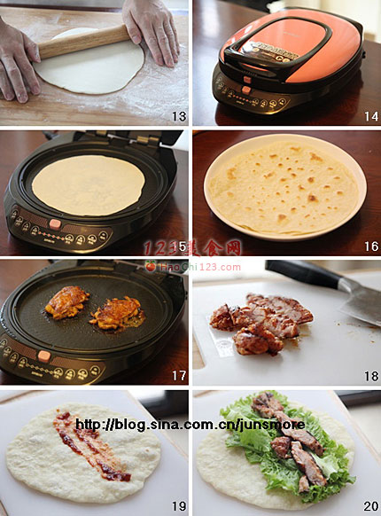 16、烙好的面饼,和电饼铛下盘接触的一面会出现焦黄色的斑点。将面饼放在盘子里,在电饼铛下盘刷一层油,继续烙下一张(烙好的饼一张张摞起来就行了,在烙好的面饼表面盖一个锅盖或者湿布,使面饼能保持柔软,不会发硬)。一共可以烙4张饼,我们只需要用两张就可以了,当然,如果你家里人比较多,将酱汁和鸡腿的用料加倍,就能做4个鸡腿肉卷哈。