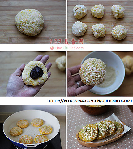 3、将面团分成50克每个的小剂子,压扁后包入豆沙馅,收口后压成饼状,抹少许清水蘸满白芝麻。