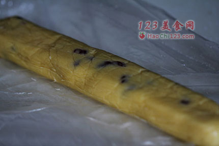 6、拌好的面糊整形成长条形,放入袋子中入冰箱冷藏30分钟。