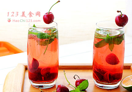 10、在杯子边缘点缀上小樱桃,饮用前搅拌均匀味道更佳。