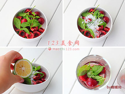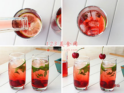 6、将腌制好的樱桃和薄荷及汤汁分装进杯子中。