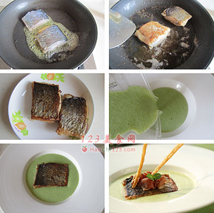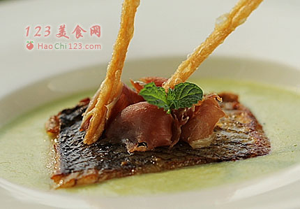 3、将豆泥倒入碗中,中间放入鱼块,再将火腿片摆放在上面,插上两根馓子和放上一片薄荷叶做装饰。[sushi.laoyanhuo.com]