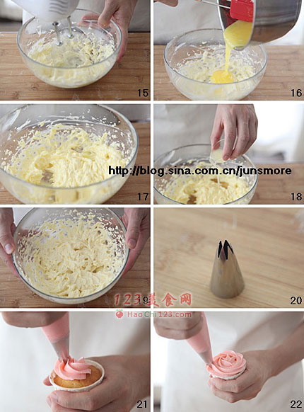 19、再次搅打均匀,奶油霜就做好了。做好的奶油霜,可以根据个人喜好添加少许食用色素,调出自己喜欢的颜色(成品图的奶油霜调成了粉色)。