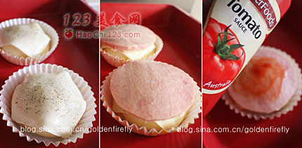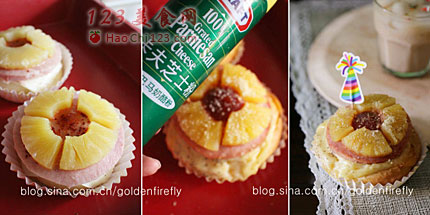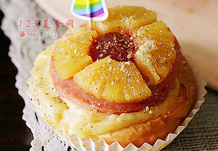 9、火腿片上抹些许番茄酱,再铺上凤梨切片,并洒上适量芝士粉。
