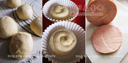 8、发酵好的面团胚表面放上芝士片,洒些许黑胡椒粉后,放置一块厚切火腿片。