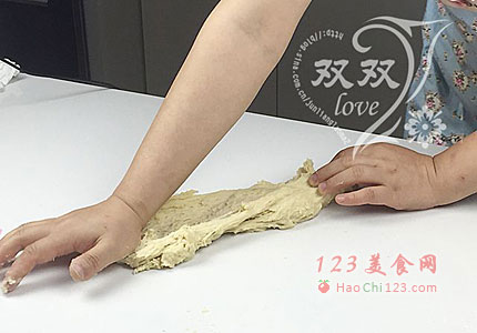 2、取出饧好的面团,用手不断搓长,拉抻。待能拉出大片薄膜的时候,加入软化的黄油,继续重复这个动作(这个过程就是一个不断拉长,折叠,再拉长的过程,不断的抻拉的过程中,把面团的筋度拉出来,如果不想用力摔打,那就用这个方法吧,不费力,也能轻松出膜)。