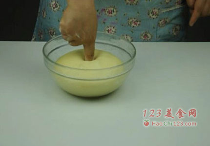 4、将面团滚圆,放盆中,盖保鲜膜,静置发酵至2倍大。面团发酵完成,用食指粘少许面粉,插入面团中,不回弹,不塌陷,就说明发酵完成了(视频里面截图,所以清晰度差点)。