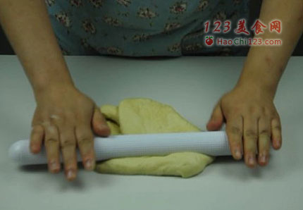5、将发酵好的面团取出,用擀面杖擀压,排气(将气体排彻底,土司组织会更规则、细腻)。
