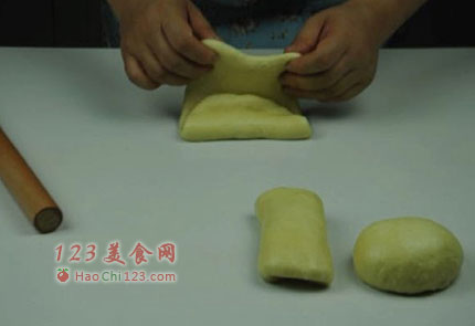 7、取一个面团,擀成长椭圆形,三分折叠,截面朝下放置(再次松弛10分钟)。