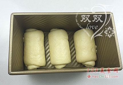 10、将其均匀放置在土司盒内(为防止土司三峰一样高,记得三份面团分的要一样重,预留空隙尽量一致)。
