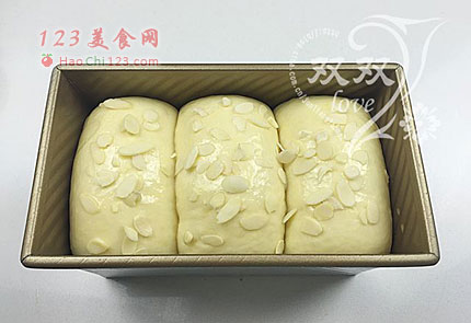 12、发酵至8分钟,取出,刷蛋液。撒杏仁片点缀(芝麻、杏仁片等等)。