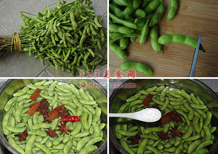 2、锅中加水,放入八角、桂皮、干辣椒,水开后放入毛豆煮一刻钟,加适量盐调味再煮两分钟即可。