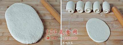 4、将大面团分成50克/个的小面剂子,依次擀开卷起,分别擀成小面卷用保鲜膜盖上待用。