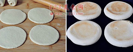 6、等馍剂子发酵胀大一些后,放入电饼铛两面烙至金黄即可。最先擀好的发酵的最好,所以要按照顺序烙,前面的烙熟了,后面的也就二次发酵好了。