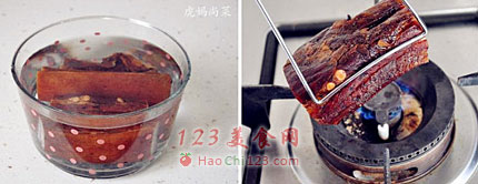 8、若腊肉皮上有猪毛,就用夹子夹住放小火上烧烤,等表皮烧黑后关火。若猪皮上很干净,没猪毛,这步可以省略,直接煮。