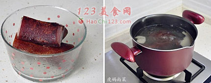 10、将腊肉跟冷水一起下锅,大火煮开后,中火再续煮半小时左右。煮肉的时候能煮去一部分油脂跟杂物,锅中奶白色的就是煮出的腊肉油脂。