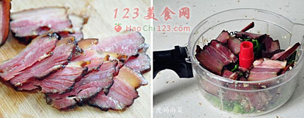 12、青辣椒切成小块,跟腊肉片一起放入料理机。