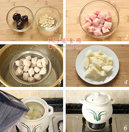 5、取一汤煲,下入雪梨、里脊肉、蜜枣和泡好的南北杏,加入过滤水至九成满。