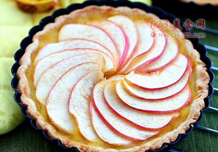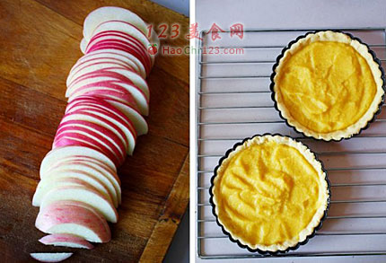 8、将苹果泥倒入派皮约6分满,以圆形重叠方式排列苹果片,置于冰箱冷藏约10分钟,再放入175度烤箱烤25分钟,直到苹果变软即可。