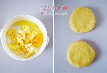 2、揉成面团后等分2份,压成约2公分厚,用保鲜膜包起来置于冰箱冷藏30分钟。