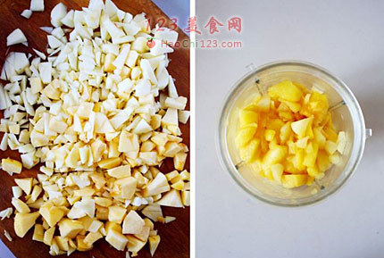 4、将煮过的苹果丁放入食物料理机,打成泥状。