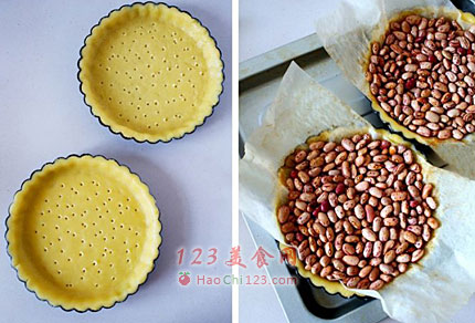 6、烤箱预热185度,在派皮上铺一层油纸,再放满豆子,进烤箱烤约15分钟,降至160度再烤15分钟,烤至派皮变色底部变硬,取出放凉。