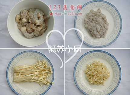 5、将虾泥、猪肉泥、金针菇丁加入腌好的虾仁中,加入姜末(可稍微多一点)、少许盐、料酒、搅拌均匀。