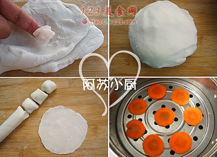 3、取烫面在案板上揉呀揉,分几次加入剩余的20克淀粉。