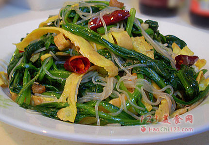 9、趁热炒香的蒜瓣、干辣椒段和底油一起浇在菠菜上,放入炒香的海米,加盐、糖、醋、生抽拌匀即可开吃了。