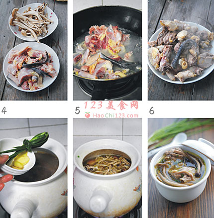 4、另起一砂锅,将绰好水的鸡块放入砂锅中,加姜片和葱同炖。