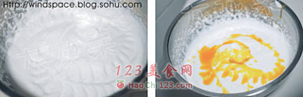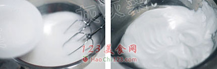 2、蛋清加几滴醋及分三次加入白糖打发。