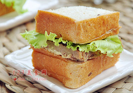 8、然后依次放上生菜跟土豆牛肉饼,再盖上另一片面包即可。