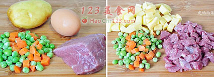 2、转天早起取出,将牛肉跟土豆都切成小块。
